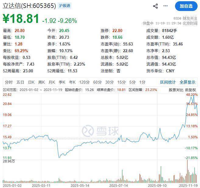 二级市场上,截至今日午间休盘,立达信下跌9.26%报18.81元/股,总市值94.43亿元。今年以来,公司股价已上涨23.23%。
