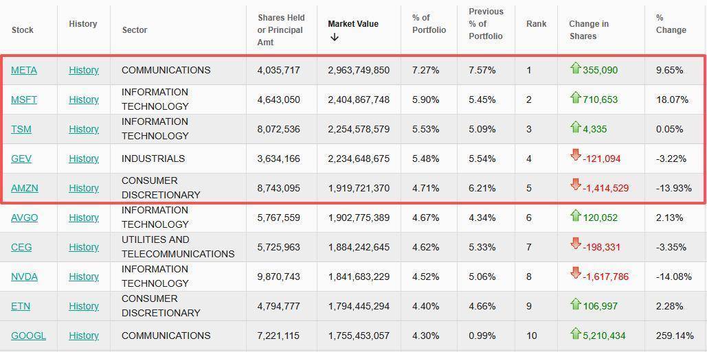 GE Vernova(GEV.US)位列第四,持仓约363万股,持仓市值约为22亿美元,占投资组合比例为5.48%,较上季度的持仓数量减少3.22%。