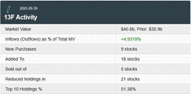 在前五大重仓股中,Meta(META.US)位列第一,持仓约404万股,持仓市值约为30亿美元,占投资组合比例为7.27%,较上季度的持仓数量增加9.65%。